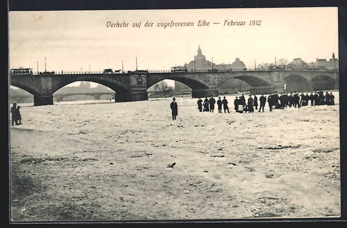 AK Dresden, Verkehr auf der zugefrorenen Elbe 1912