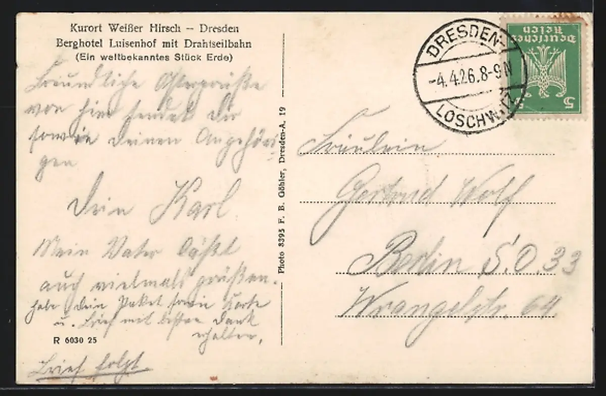 AK Dresden-Weisser Hirsch, Berghotel Luisenhof mit Drahtseilbahn