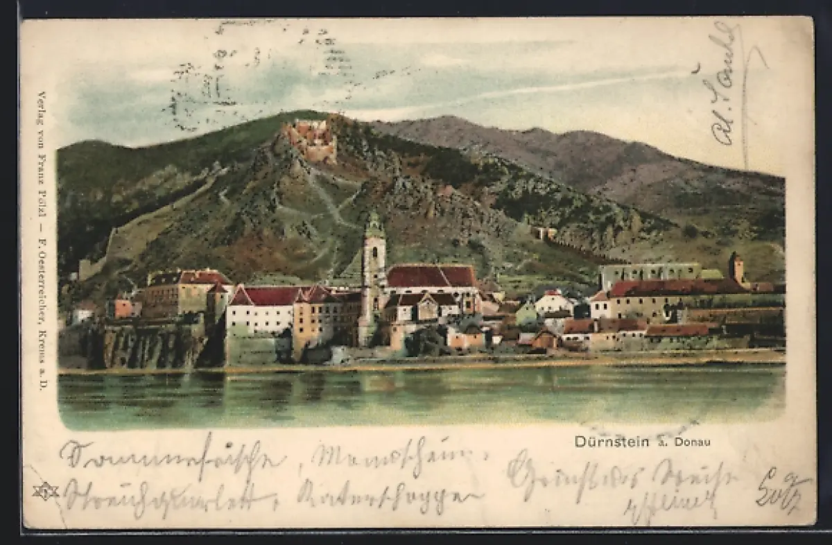 AK Dürnstein a. Donau, Uferpartie mit Blick ins Gebirge