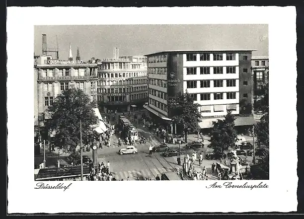 AK Düsseldorf, Geschäftshäuser am Corneliusplatz mit Strassenbahn