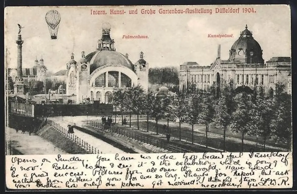 AK Düsseldorf, Kunst- u. Gartenbau-Ausstellung 1904, Sonderausstellungspavillon mit Kunstpalast u. Ballon