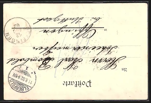 alte Ansichtskarte, gelaufen 1902, Eckknick li. oben, minimaler Einriss li. oben, guter Zustand
