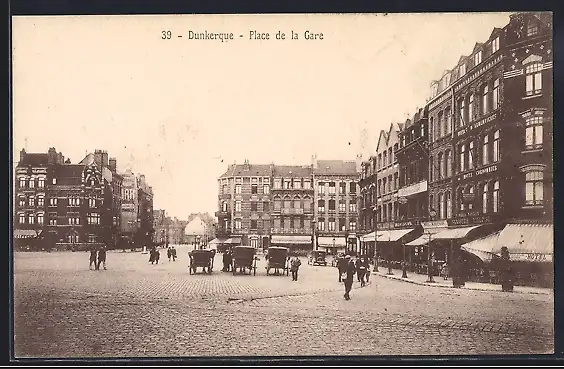 AK Dunkerque, Place de la Gare avec calèches et passants