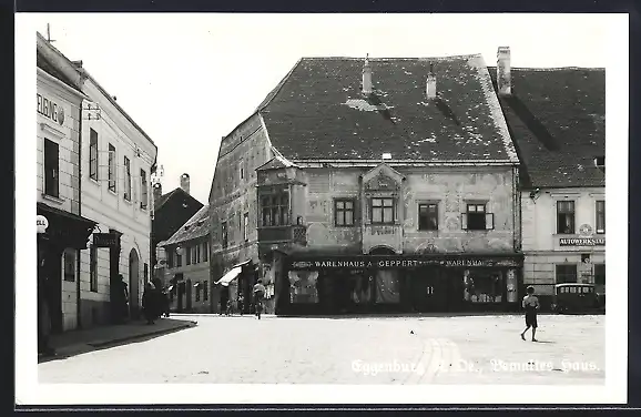AK Eggenburg /N.-Oe., Bemaltes Haus mit Geschäft A. Geppart, Autowerkstatt, Tanksäule Shell