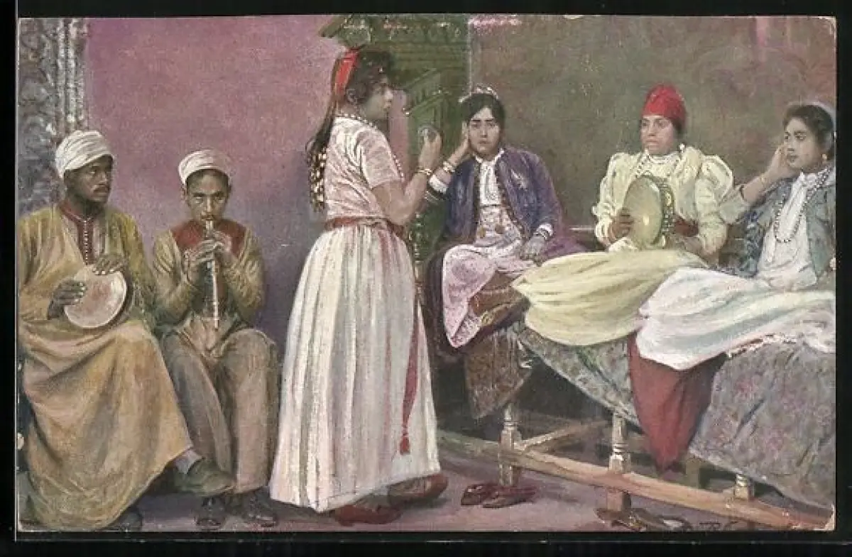 AK Egypt, Egyptian Types and Scenes, Arabs Dancing Women, Arabische Tänzerin und Musiker