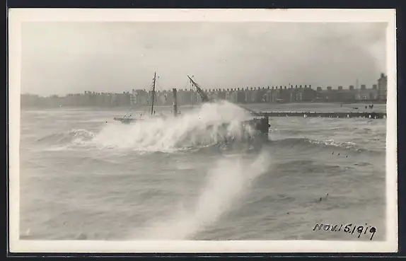 AK Ein Schiff havariert im starken Wellengang vor der Küste, Seenotrettung