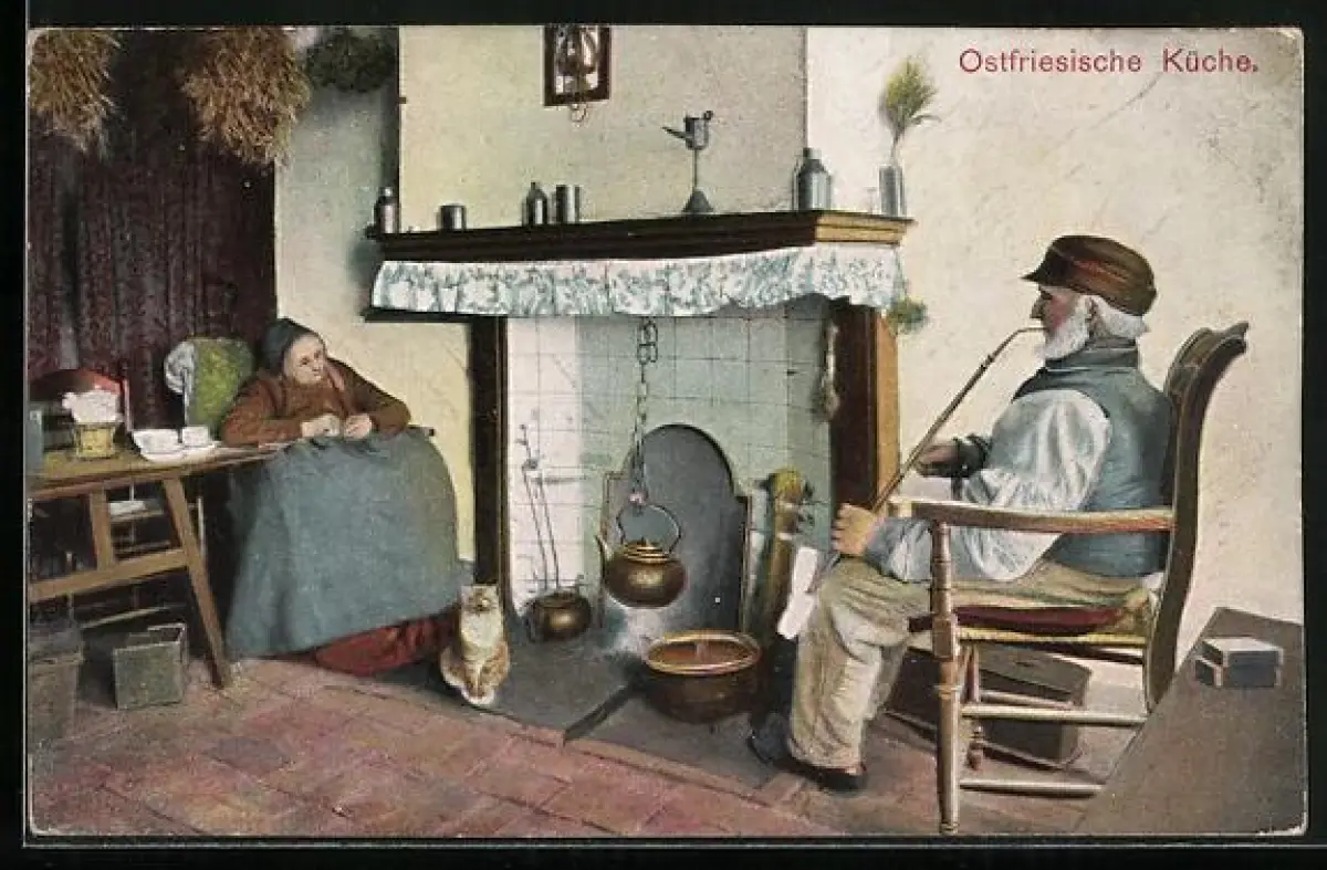 AK Ein altes Paar in einer Ostfriesischen Küche, Teekessel