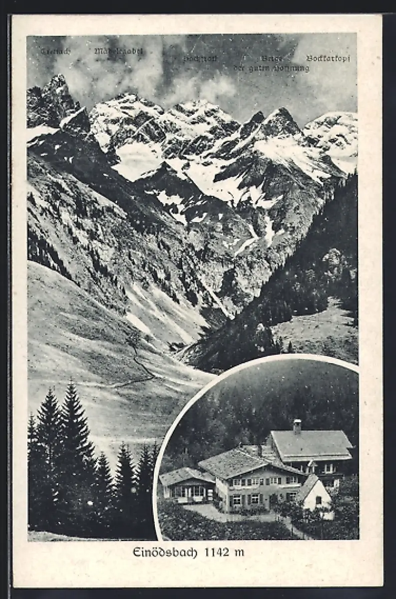 AK Einödsbach, Gasthaus Einödsbach, Panorama mit Mädelegabel, Trettach und Bockkarkopf