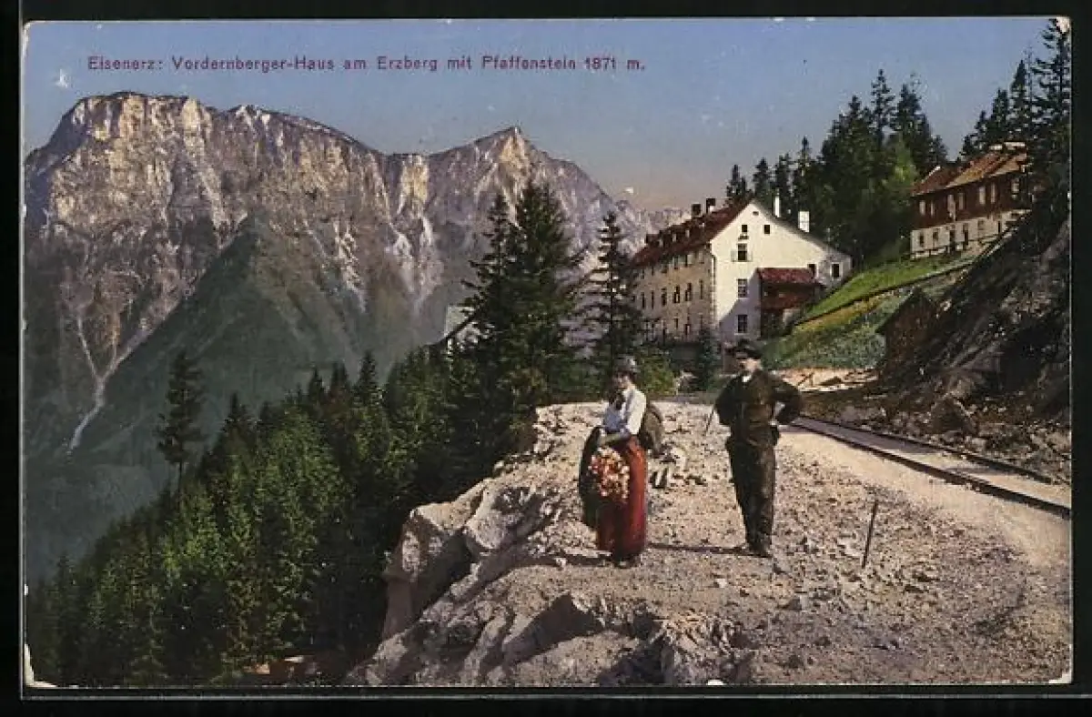AK Eisenerz, Vordernberger-Haus am Erzberg mit Pfaffenstein