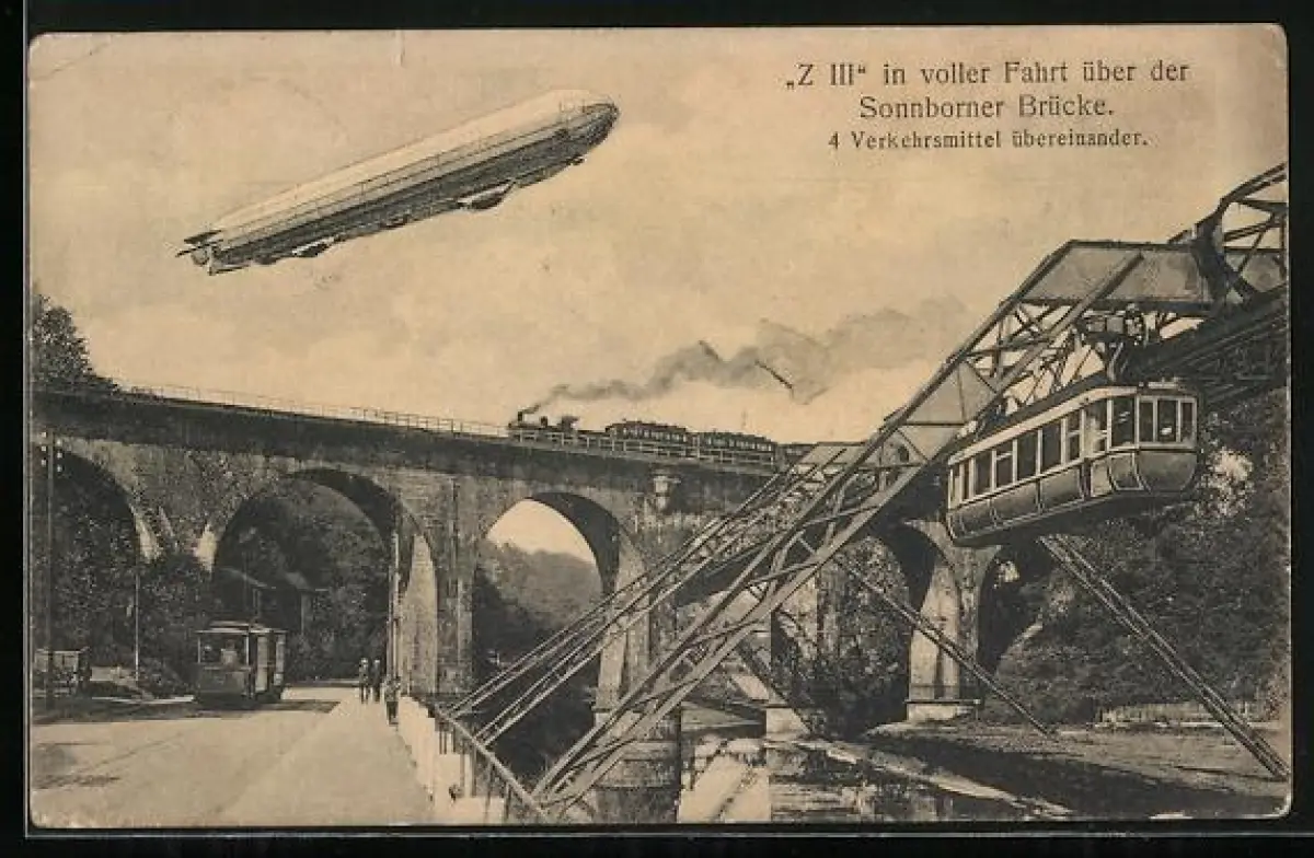 AK Elberfeld, Sonnborner Brücke mit Schwebebahn, Dampfzug, Strassenbahn und Zeppelin Z III