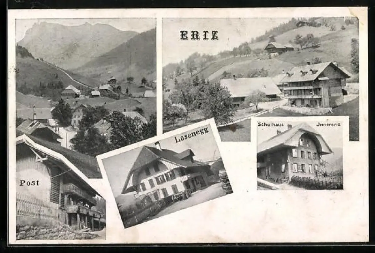 AK Eriz, Gasthaus Losenegg, Postgebäude, Schulhaus Innereriz