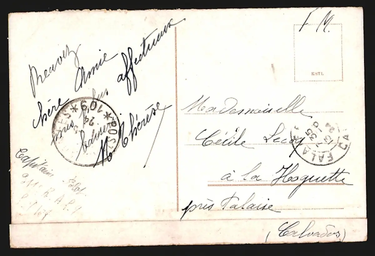 Personenbezogene Daten auf der Rückseite der Karte wurden durch blauen Textmarker unkenntlich gemacht. Die blauen Stellen sind auf die Vorderseite durchgeweicht und wirken sich negativ auf das Postkartenfoto aus