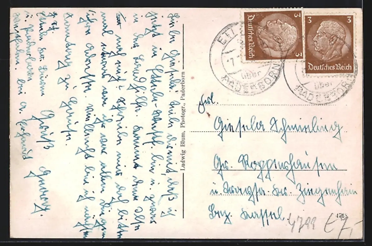 Personenbezogene Daten auf der Rückseite der Karte wurden durch blauen Textmarker unkenntlich gemacht. Die blauen Stellen sind auf die Vorderseite durchgeweicht und wirken sich negativ auf das Postkartenfoto aus