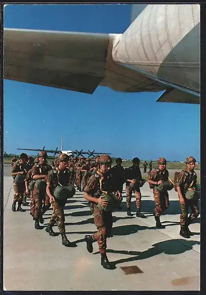 AK Fallschirmjäger auf dem Weg zum Flugzeug