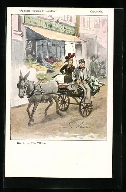 AK Familiar Figures of London, The Coster, Dame fährt mit einer Eselskutsche