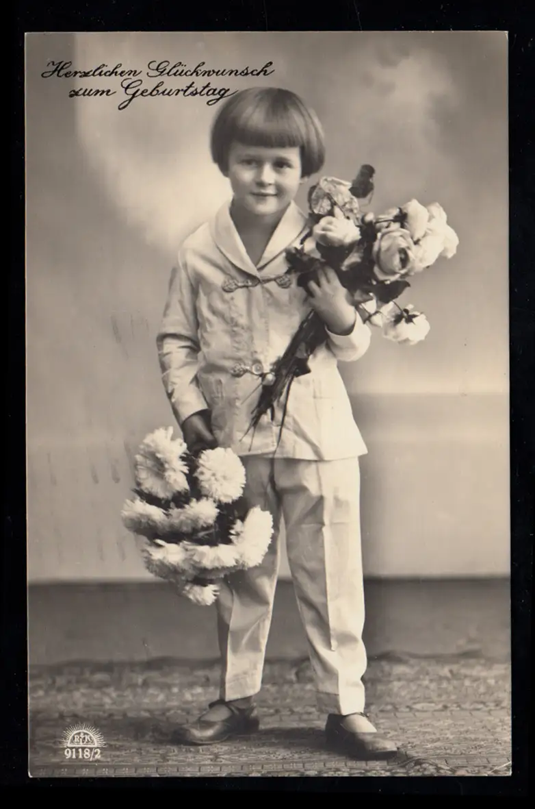 AK Félicitations anniversaire: Fille en costume blanc avec des fleurs, PLAFON 27.11.29