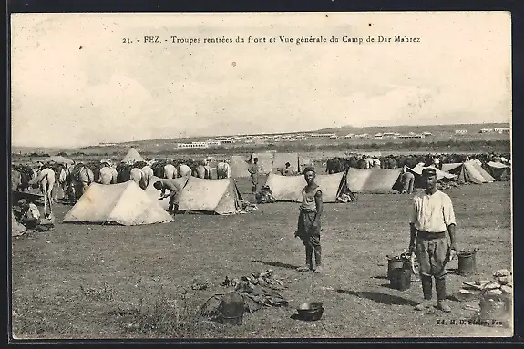 AK Fez, Troupes rentrées du front et Vue générale du Camp de Dar Mahrez