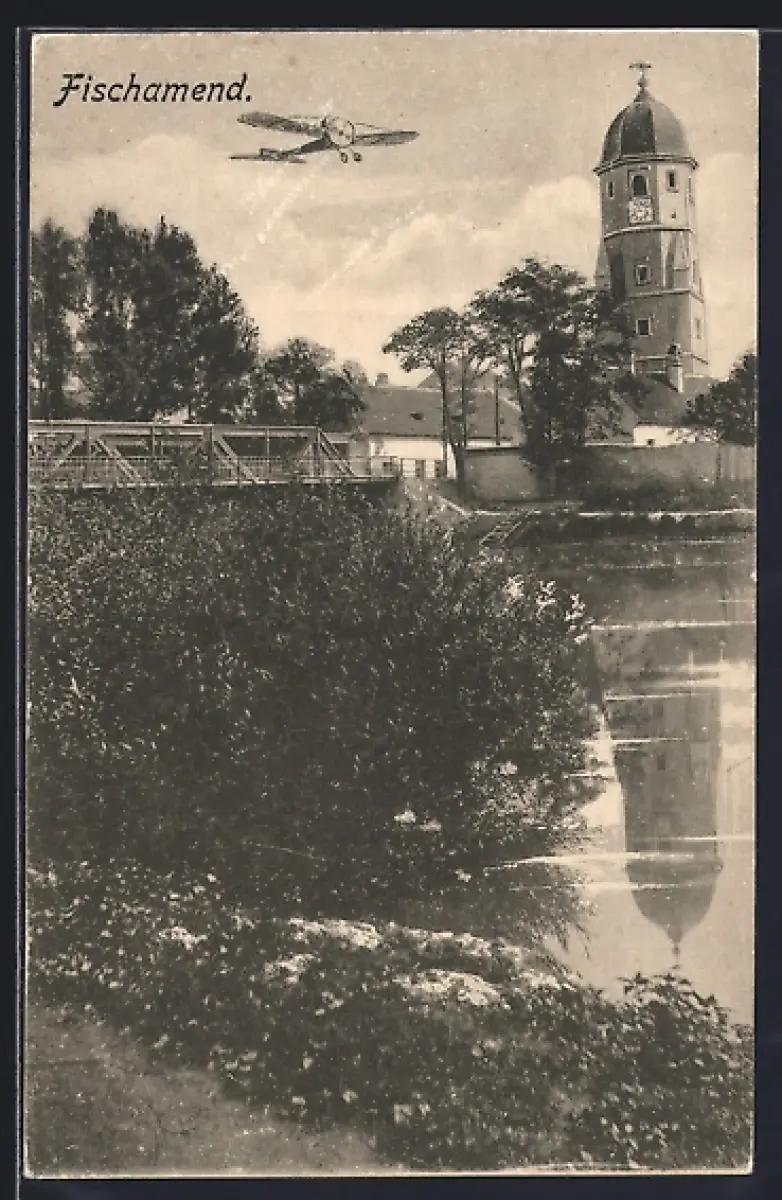 AK Fischamend, Teilansicht mit Brücke, Flugzeug über der Ortschaft