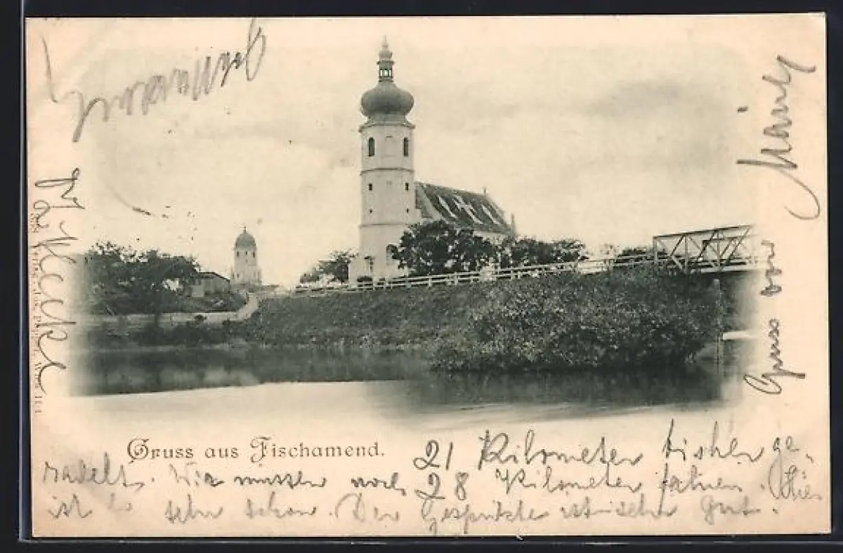 AK Fischamend, Uferpartie mit Blick auf die Kirche