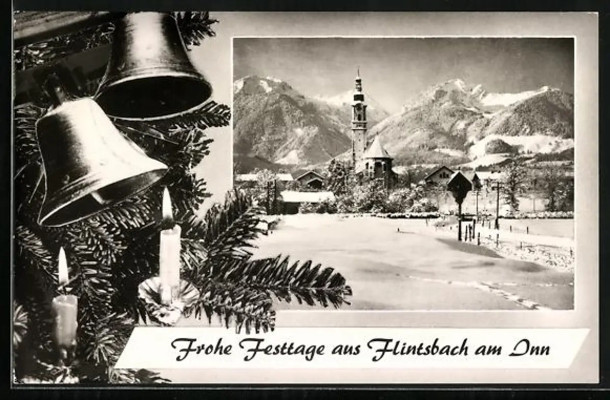 AK Flintsbach am Inn, Winterlandschaft mit Kirche und festlicher Weihnachtsdekoration