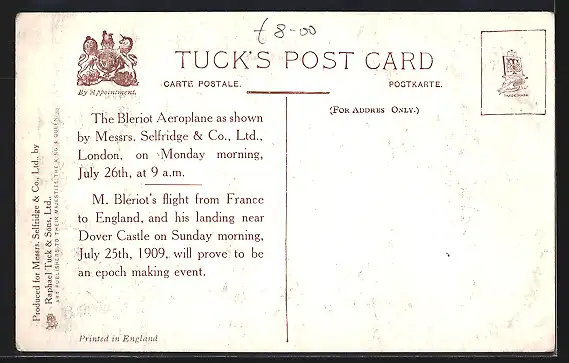 AK Flugzeug M. Blériot, Pilot M. Louis Blériot, Überquerung des Ärmelkanals 1909