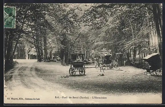 AK Forêt de Bercé, L`Hermitière avec calèches dans la clairière boisée