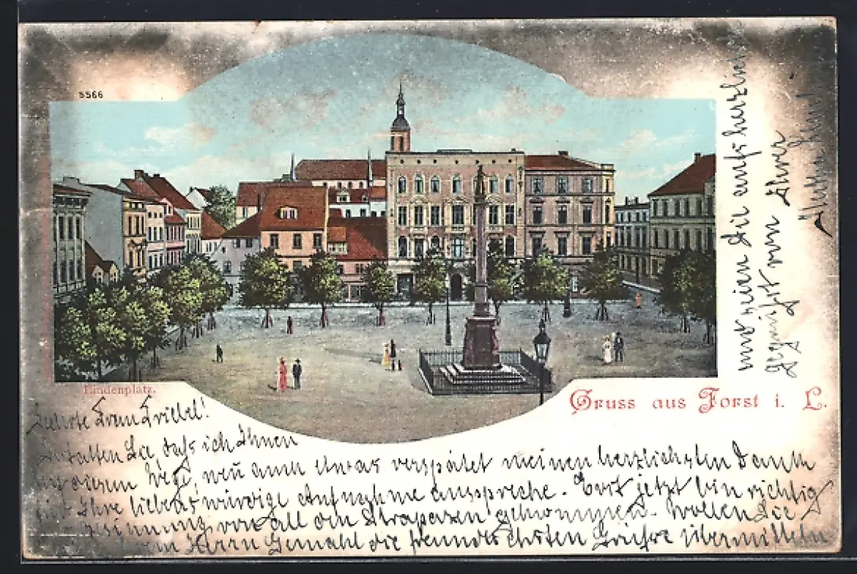 AK Forst i. L., Lindenplatz mit Säulendenkmal aus der Vogelschau