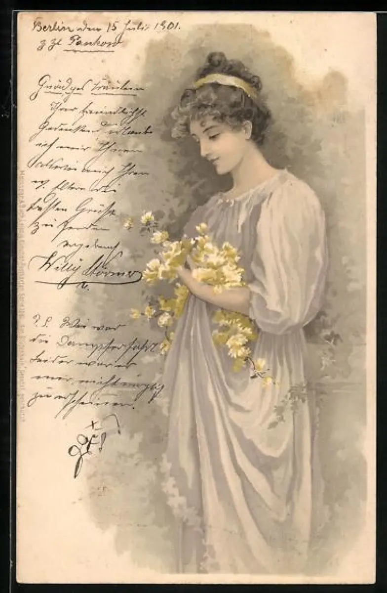 AK Fräulein im Kleid mit Blumen, Jugendstil