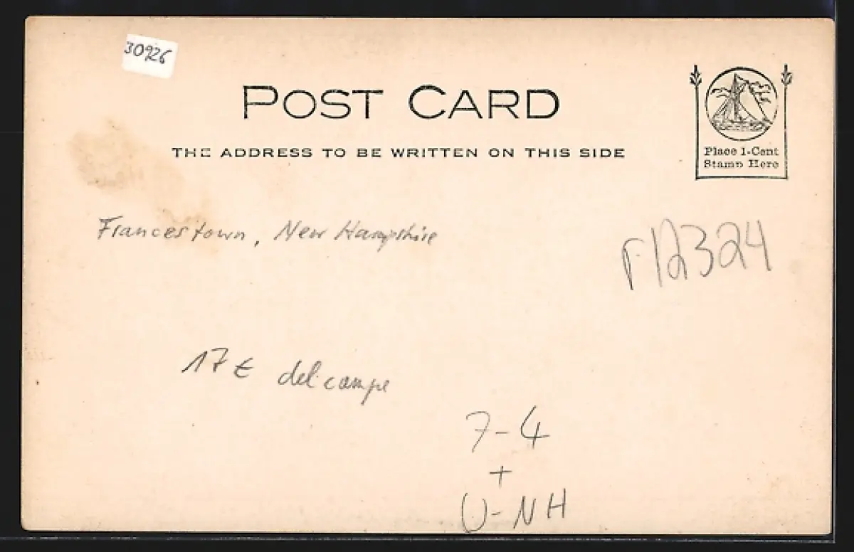 Personenbezogene Daten auf der Rückseite der Karte wurden durch blauen Textmarker unkenntlich gemacht. Die blauen Stellen sind auf die Vorderseite durchgeweicht und wirken sich negativ auf das Postkartenfoto aus