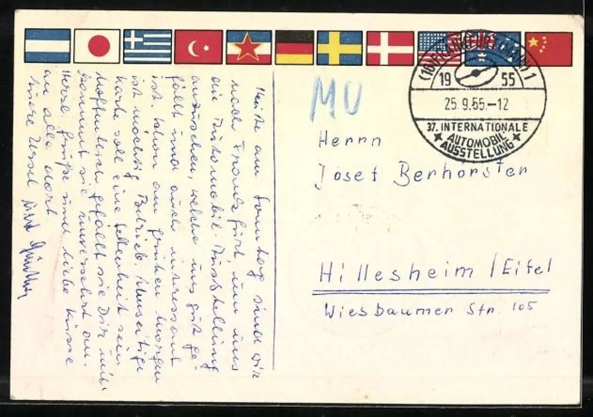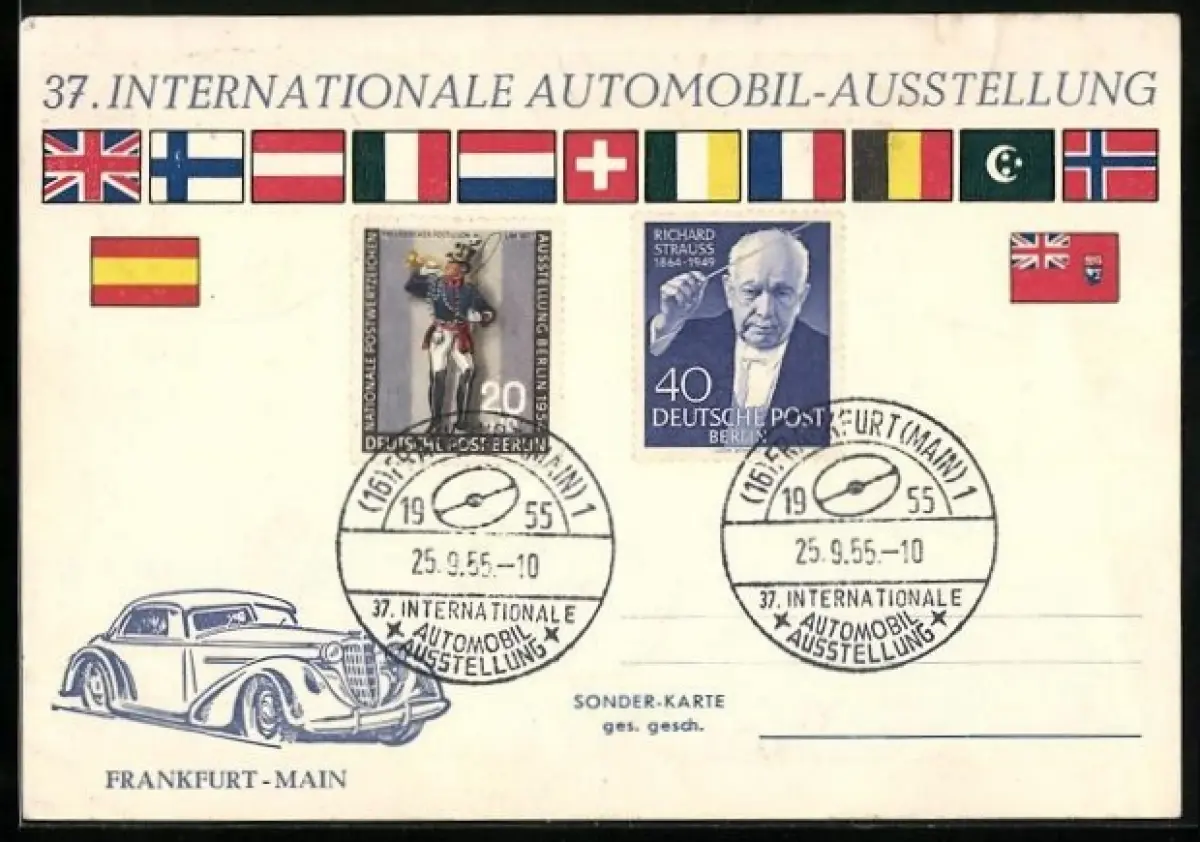 AK Frankfurt /Main, 37. Internationale Automobil-Ausstellung 1955, Auto und Landesfahnen