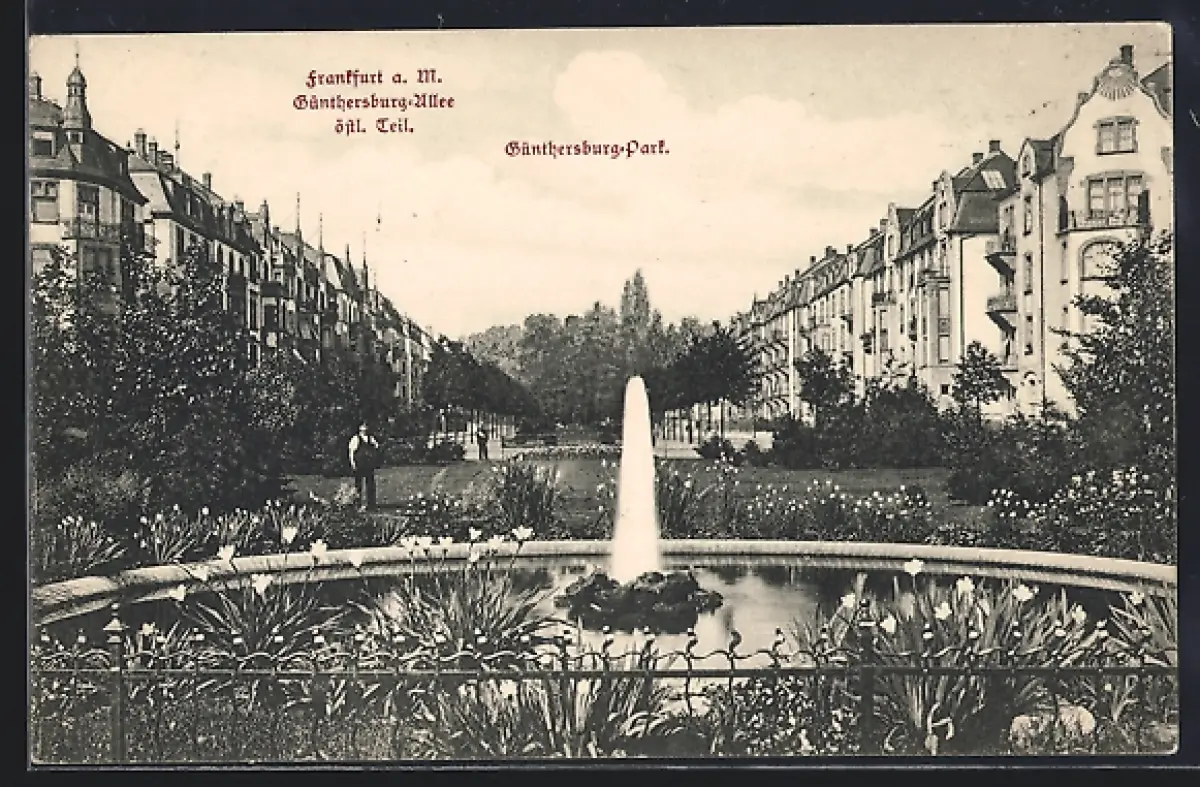 AK Frankfurt-Nordend, Günthersburg-Park mit Günthersburg-Allee, Fontäne