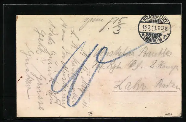 Personenbezogene Daten auf der Rückseite der Karte wurden durch blauen Textmarker unkenntlich gemacht. Die blauen Stellen sind auf die Vorderseite durchgeweicht und wirken sich negativ auf das Postkartenfoto aus