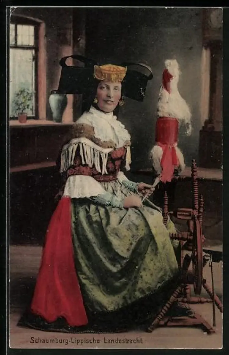 AK Frau in Schaumburg-Lippischer Landestracht sitzt am Spinnrad