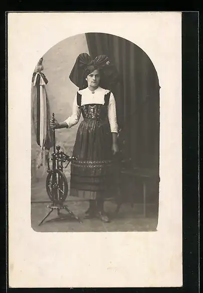 AK Frau in elsässer Tracht nebst Spinnrad stehend