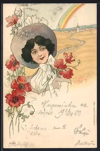 AK Frau mit grossem Hut und Mohnblumen in der Hand, Regenbogen