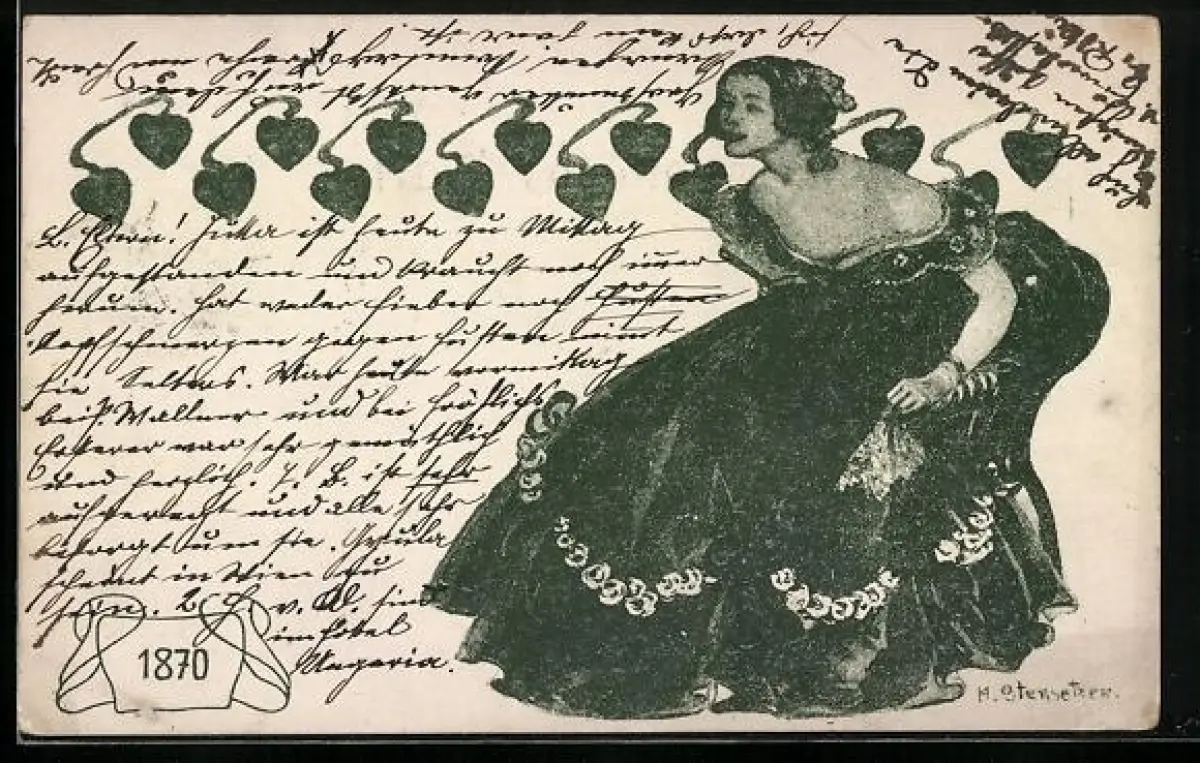 AK Frau mit vielen Herzen, Jugendstil, 1870