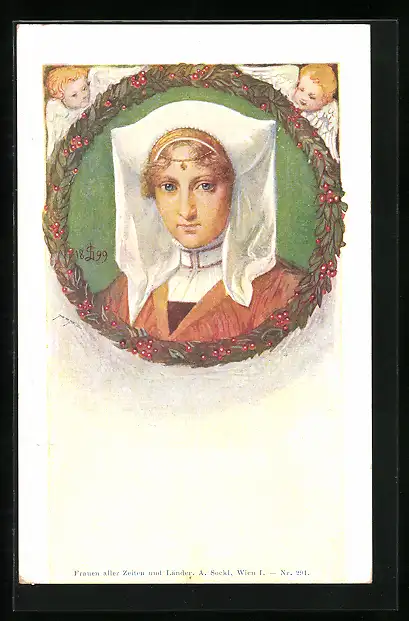 AK Frauen aller Zeiten und Länder, Portrait einer Frau mit Haube, Engelsköpfe