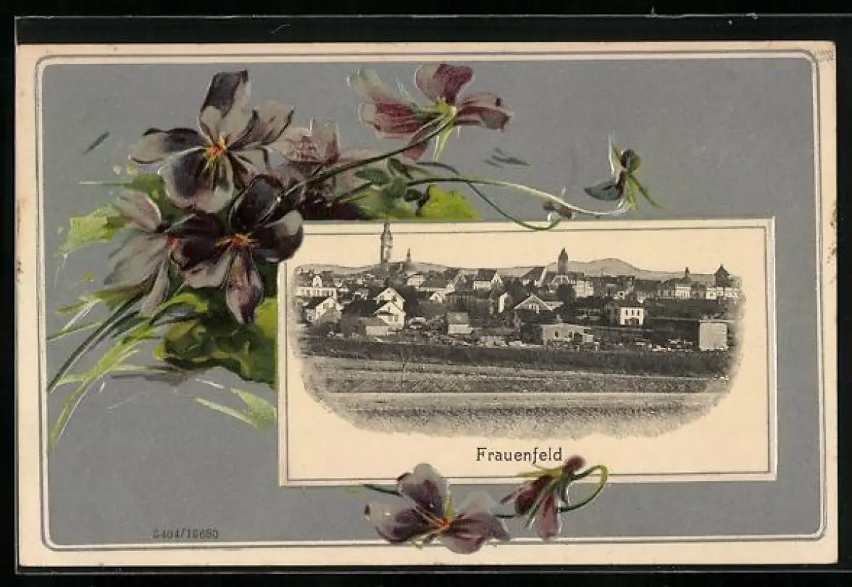 AK Frauenfeld, Teilansicht, Veilchen, Passepartout