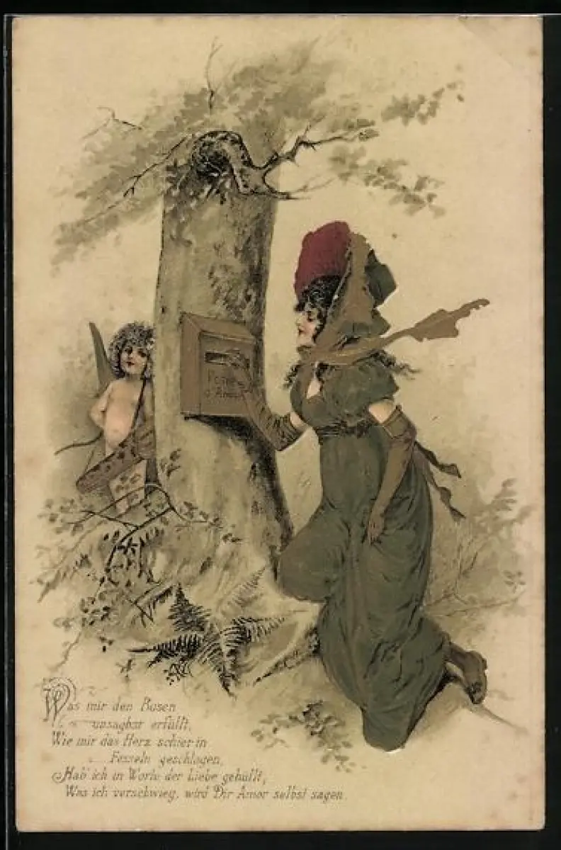 AK Fraulein wirft Brief für Amor ein, Jugendstil