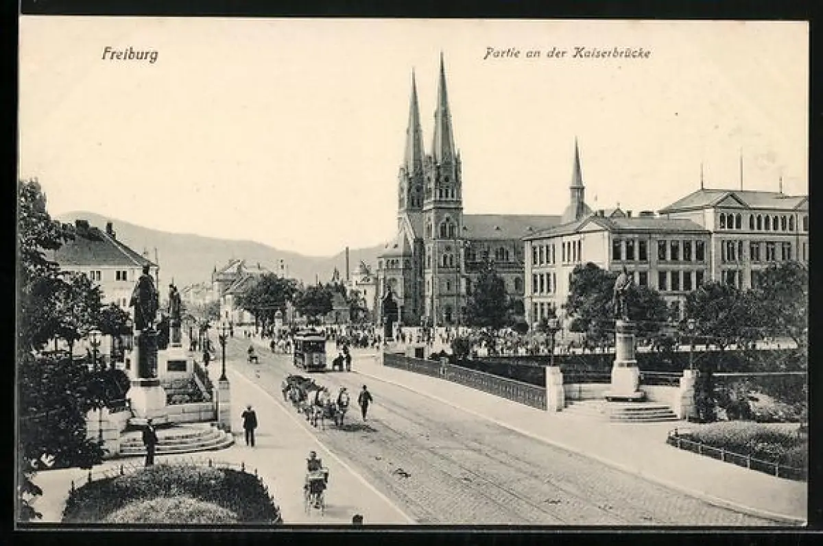 AK Freiburg i. B., Partie a. d. Kaiserbrücke mit Strassenbahn
