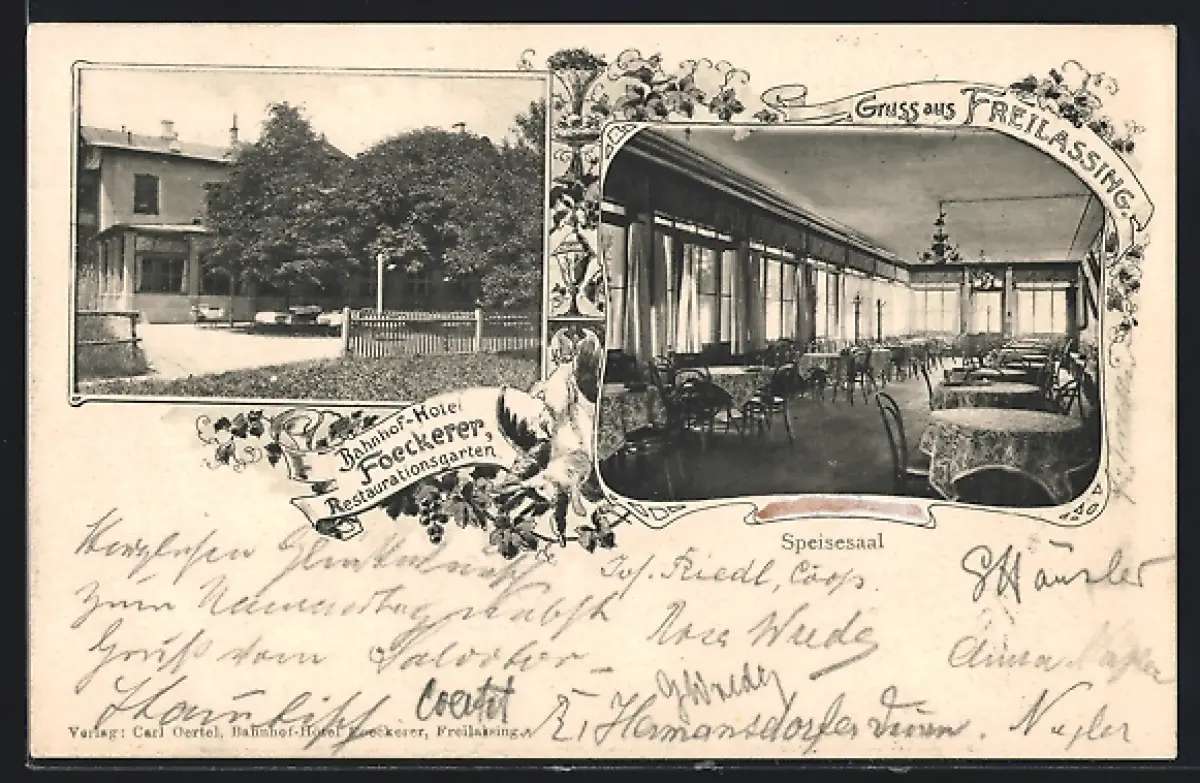 AK Freilassing, Bahnhof-Hotel Foeckerer mit Speisesaal