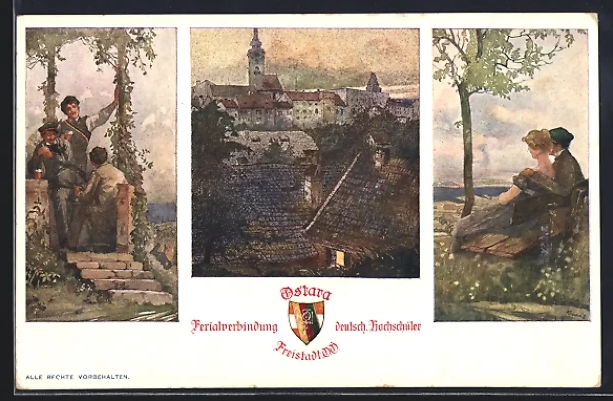 AK Freistadt, Teilansicht mit Kirche, Ferialverbindung deutsch. Hochschüler Ostara, Student. Szene, Verliebtes Pärchen