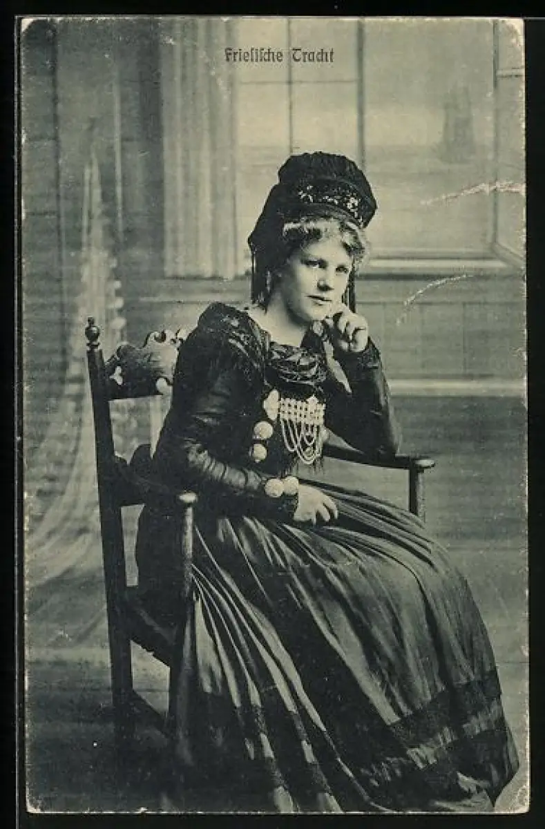 AK Friesische Tracht, Junge Frau sitzt auf einem Stuhl