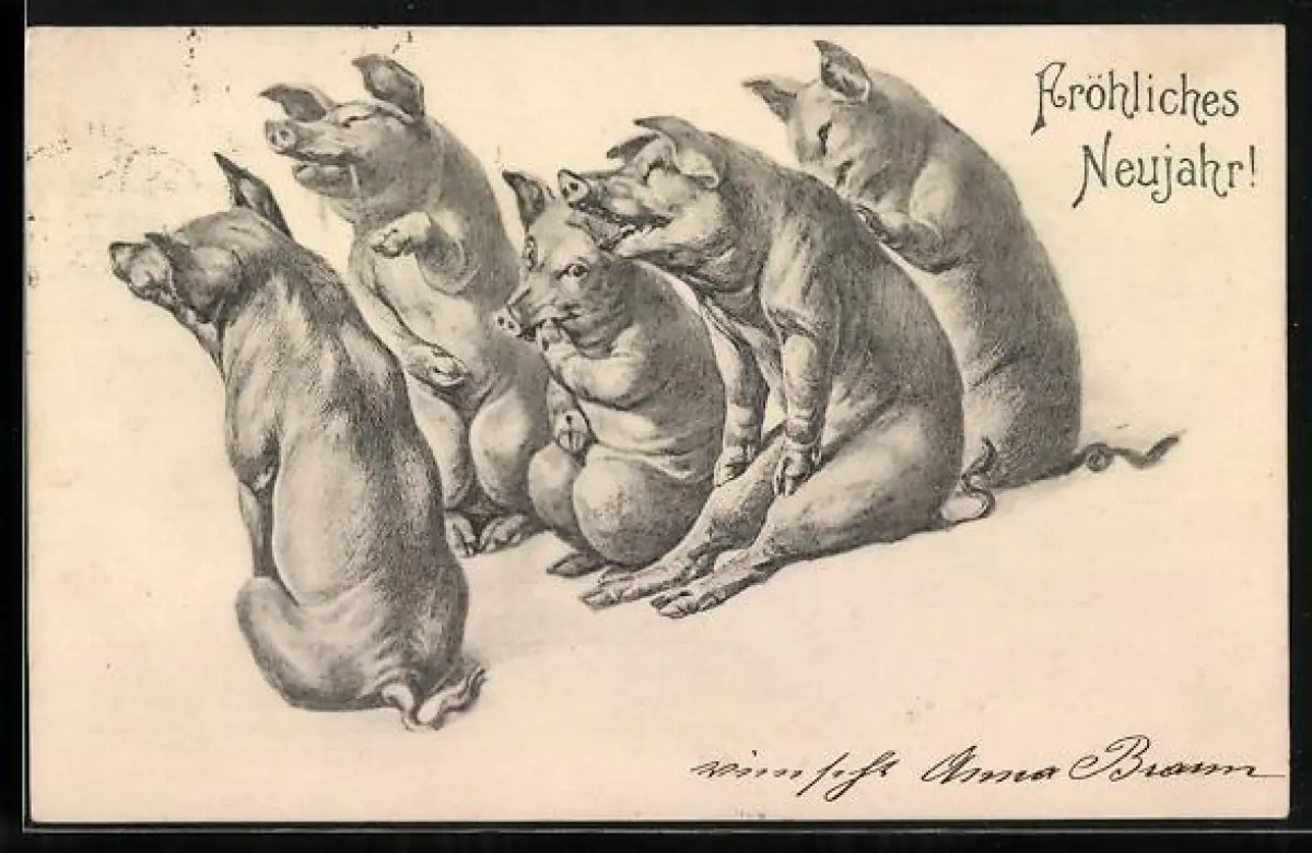 AK Fröhliche Schweine in geselliger Runde, Fröhliches Neujahr! vermenschlichte Tiere