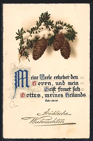 AK Fröhliche Weihnachten, Verschneiter Tannenzweig, Meine Seele erhebet den Herrn...