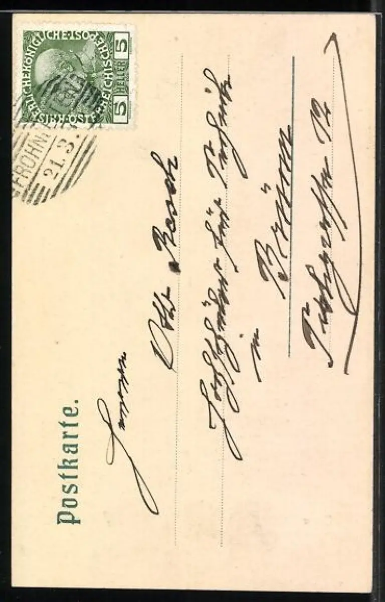 Personenbezogene Daten auf der Rückseite der Karte wurden durch blauen Textmarker unkenntlich gemacht. Die blauen Stellen sind auf die Vorderseite durchgeweicht und wirken sich negativ auf das Postkartenfoto aus