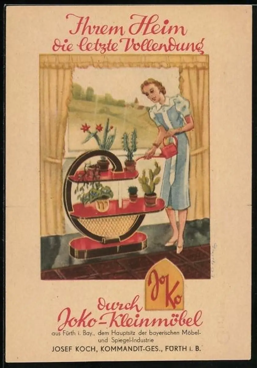 AK Fürth i. B., Junge Frau beim Giessen von Kakteen auf Joko-Kleinmöbel