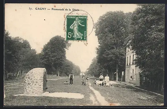 AK Gagny, Promenade de la Dhuis avec promeneurs et chiens