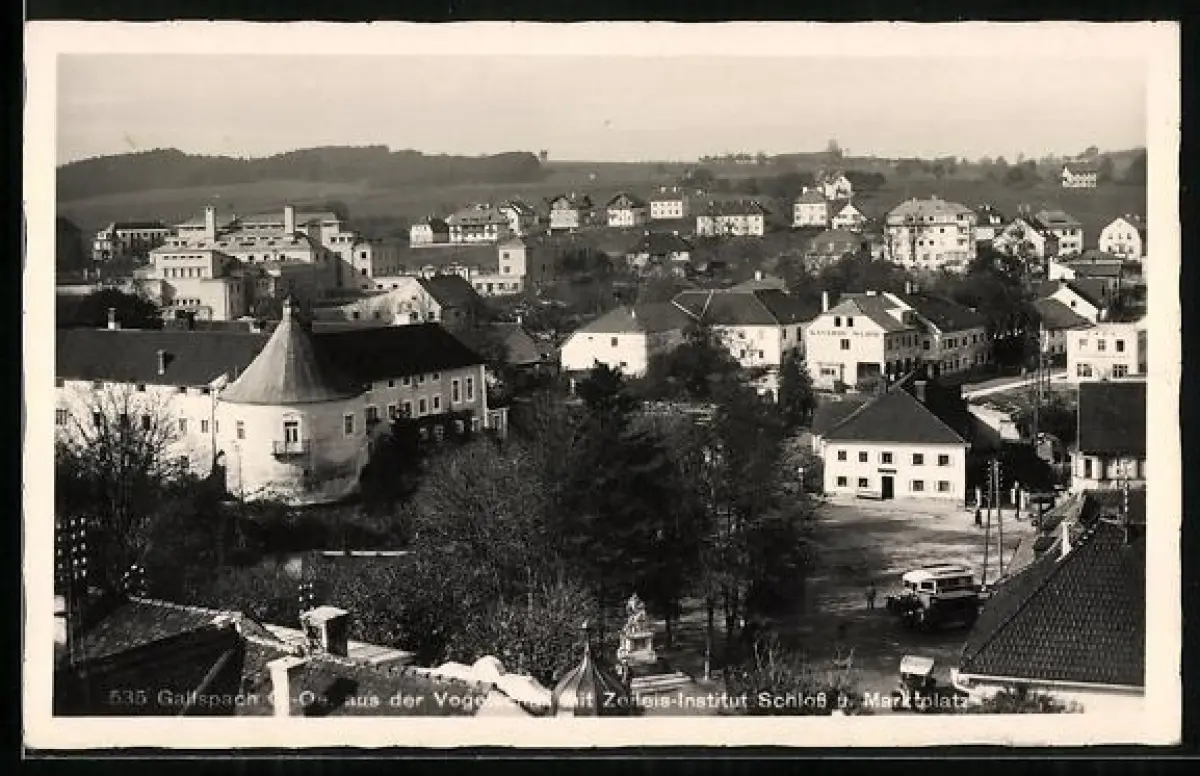 AK Gallspach, Schloss, Markt und Zeileis-Institut aus der Vogelschau