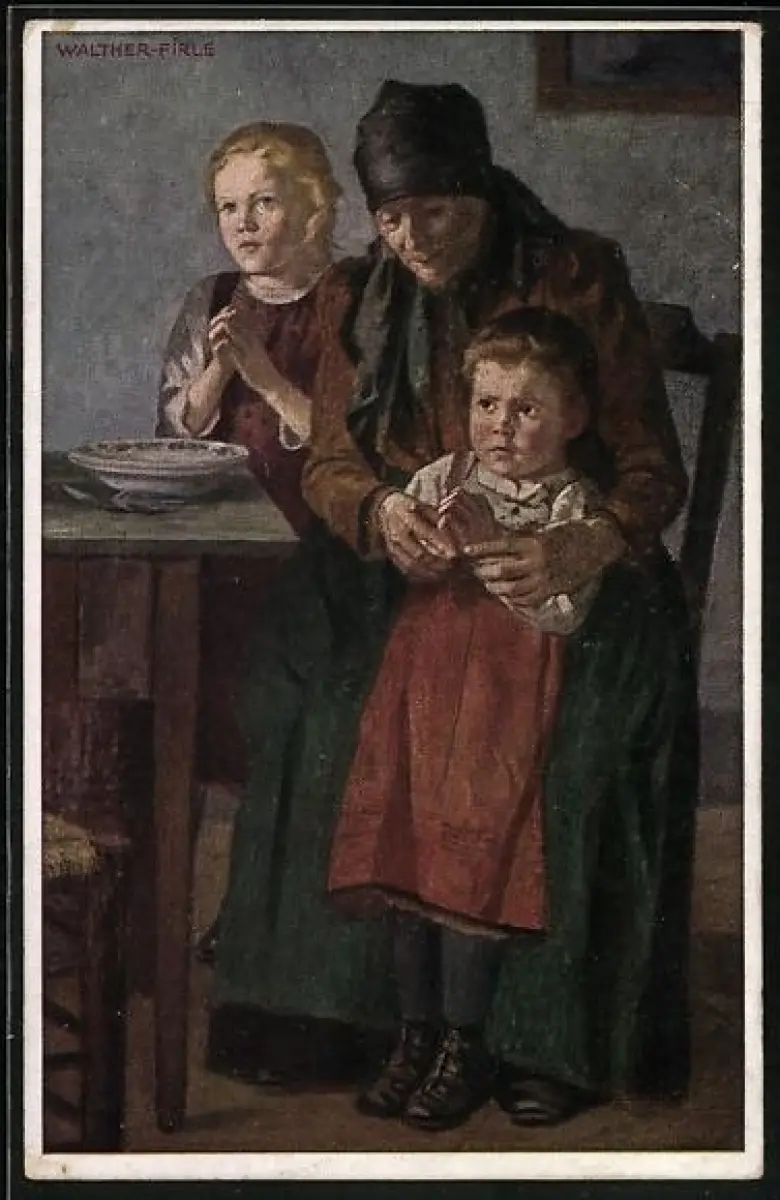 AK Ganzsache PP43 E1 /01: Kinderfürsorge für Säuglings- und Kleinkinderschutz, Mutter mit Kindern beim Mittagsgebet